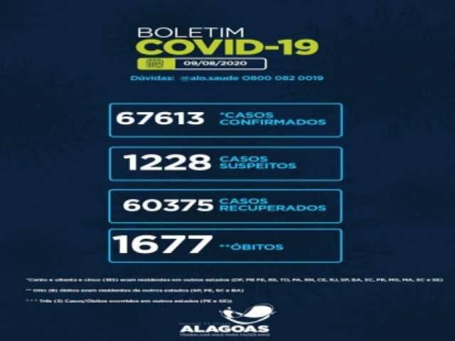 Alagoas tem 67.613 casos da Covid-19 e 1.677 óbitos