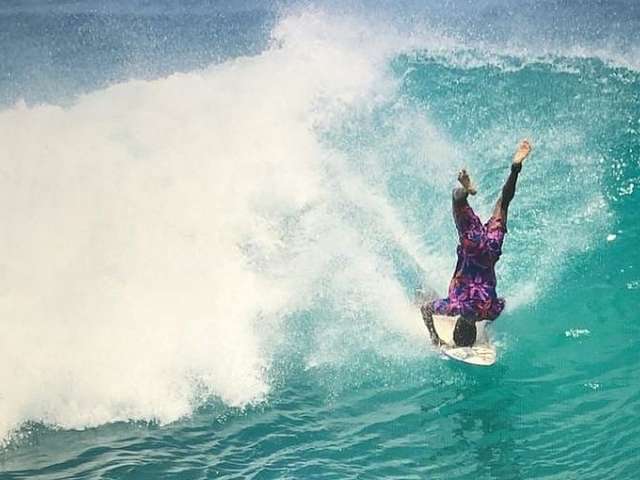 Surfista 'planta bananeira' enquanto pega onda em Fernando de Noronha