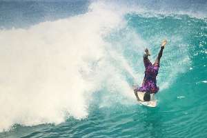 O surfista Buday Santos, que é conhecido em Fernando de Noronha por pegar ondas com um colchão inflável, inovou outra vez nesta temporada. O atleta da ilha passou a deslizar nas ondas de cabeça para baixo, "plantando bananeira" na prancha.