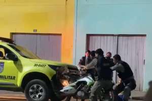 Foi iniciado um acompanhamento tático – perseguição – pelas ruas da cidade. Ao passar pelas vias do Centro, o indivíduo foi desviar dos pedestres e acabou perdendo o controle da motocicleta, vindo a derrapar o pneu trajeto, momento em que a viatura acabou colidindo na traseira da moto.