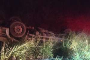 O motorista do caminhão contou aos policiais que tentou desviar de uma moto que invadiu a contramão, quando perdeu o controle do veículo e capotou.