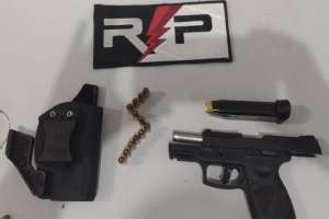 As guarnições prontamente se deslocaram para o local informado e após procederem a abordagem do suspeito com as características informadas foi constatado que o mesmo estava portando uma pistola Taurus de calibre 9mm.