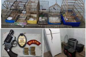 A autoridade policial disse que durante a operação policial foram apreendidos um revólver calibre 38, 11 munições do mesmo calibre; um cartucho calibre 12, e ainda foram recuperados vários objetos: uma geladeira, uma TV Smart, um aparelho de som, um DVD, uma escova elétrica, um celular, além de diversas espécies de pássaros, e uma moto Honda, de cor vermelha, utilizada nos crimes.