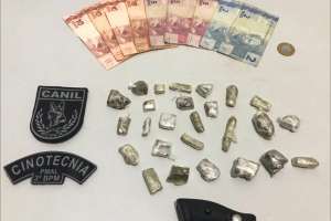 Ao chegar no local, o suspeito foi localizado e com a devida autorização do mesmo foi feita uma busca na residência, onde foram encontradas 26 bombinhas de maconha, R$ 60 em dinheiro e um cabo de revólver em madeira.