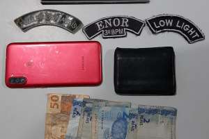 Um dos rapazes jogou um celular no chão, na tentativa de se livrar. O aparelho tinha sido roubado minutos antes na Rua Bela Vista, bairro Brasília, juntamente com uma carteira com R$ 64 em espécie.