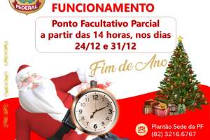 A Polícia Federal informa que, nos dias 24 de dezembro de 2021 e 31 de dezembro de 2021, haverá ponto facultativo, a partir as 14 horas, na sede da Superintendência Regional da Polícia Federal em Alagoas, com endereço na av. Walter Ananias, 705 - Jaraguá, em Maceió/AL, nos termos da Portaria Nº 430, de 30 de dezembro de 2020, do Ministério da Economia/Gabinete do Ministro (DOU publicado em 31/12/2020, Edição 250, Seção 1, Página 39), que estabelece feriados nacionais e dias de ponto facultativo no ano de 2021, para cumprimento pelos órgãos e entidades da Administração Pública federal direta, autárquica e fundacional do Poder Executivo, sem prejuízo dos serviços considerados essenciais.