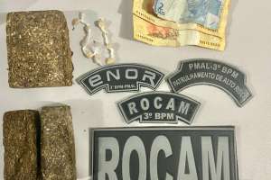 Os militares, com apoio o imprescindível da RP2, realizaram buscas nas proximidades e foi encontrada uma mochila com mais 340g de uma substância análoga à maconha, além de 32 reais em espécie com um dos envolvidos.