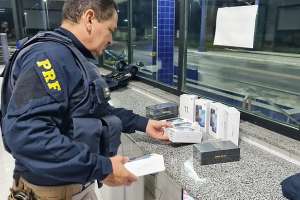 Por volta das 17 horas uma equipe abordou um veículo Peugeot/Boxer. Ao abrir o veículo, foram encontrados diversos produtos sem nota fiscal, entre eles, 11 unidades de celulares, 500 peças de vestuário e 60 pares de sapatos.