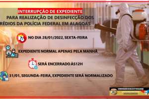 A Polícia Federal informa que, tendo em vista o aumento da Síndrome Gripal decorrente de infecção por Covid-19 e por Influenza, ensejando, assim, a necessidade de promoção de novas medidas de prevenção ao atual cenário da pandemia do (Covid-19), a Superintendência Regional de Polícia Federal em Alagoas - SR/PF/AL promoverá a sanitização das instalações dos prédios da SR/PF/AL, da Delegacia de Repressão a Entorpecentes - DRE/DRCOR/SR/PF/AL no turno vespertino do dia 28/01/2022 (sexta-feira).