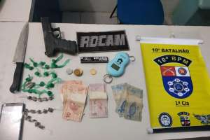 Outro fato foi registrado no mesmo município, desta feita no Conjunto Brivaldo Medeiros. A guarnição de Rocam do 10º BPM realizava patrulhamento quando recebeu uma denúncia anônima de possível tráfico de drogas. No local apontado, os policiais visualizaram um indivíduo em atitude suspeita. Ele tentou se evadir ao perceber a aproximação das viaturas e deixou cair certa quantidade de drogas. A guarnição efetuou o acompanhamento e conseguiu capturá-lo. O suposto autor foi encaminhado à delegacia para os procedimentos cabíveis juntamente com um simulacro de arma de fogo; 28 bombinhas de maconha; uma balança de precisão e ainda um pássaro silvestre (cujo cativeiro configura crime ambiental); um aparelho celular e R$43,50 em dinheiro.