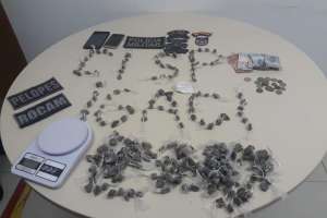 Na busca domiciliar, a polícia encontrou mais droga: 152 bombinhas de maconha. Além de uma balança de precisão, seis telefones celulares e uma quantia em dinheiro.