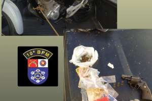 Chegando no local o sujeito foi visto, mas ele fugiu abandonado a moto que de fato tinha queixa de roubo. Além do veículo, ele também deixou para trás um revólver e uma certa quantidade de drogas.