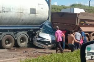 O acidente aconteceu logo no início da manhã quando o motorista de um caminhão perdeu o controle da direção entre os kms 498 e 510 da rodovia Fernão Dias, sentido Minas Gerais, atingindo vários veículos. Um carro de passeio ficou prensado entre carretas.