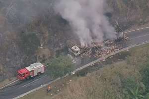 Rio de Janeiro – Um acidente envolvendo uma carreta que transportava carne bovina na Via Dutra gerou um congestionamento de cerca de 19 km na manhã desta segunda-feira (8/8). O veículo pegou fogo e interditou a pista de descida da Serra das Araras, em Piraí, no sul fluminense. O acidente aconteceu por volta das 6h20, no km 224.