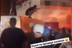 Nas imagens, é possível ver que o veículo tentou passar no meio da multidão, mas a via estava totalmente bloqueada. Dois jovens subiram no teto do carro e começaram a dançar. Ambos estavam com copos de bebida na mão e sem máscara.