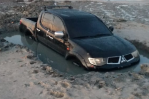 Um deles tentou usar sua caminhonete Mitsubishi modelo Triton, no valor de R$ 149 mil, para rebocar o outro veículo, mas também acabou atolado.