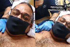 Anitta usou seu Instagram, na quinta-feira (15), para mostrar o pai, Mauro Machado, carinhosamente conhecido como Painitto, fazendo sua primeira tatuagem. De máscara e e camiseta, ele aparece deitado na maca tendo dois machados cruzados desenhados no lado direeito do peito.