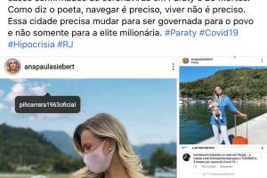 "Paraty está fechada para o turismo por decreto municipal, mas assim como o Condomínio Laranjeiras, o aeroporto da cidade está a disposição para celebridades que aqui quiserem chegar para passear com as suas lanchas. Segundo a esposa de Roberto Justos, Ana Paula Siebert, o município está aberto ao turismo para quem apresentar teste negativo para o Covid-19. Hoje, 26 de julho, são 570 casos confirmados de coronavírus em Paraty e 20 mortes. Como diz o poeta, navegar é preciso, viver não é preciso. Essa cidade precisa mudar para ser governada para o povo e não somente para a elite milionária", diz a página Trindade Vive.