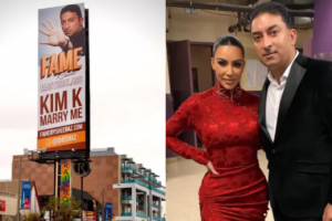 No enorme painel, há uma foto de Sheeraz ao lado da mensagem "Kim K, case-se comigo". Ao compartilhar a foto do outdoor em suas redes sociais, ele ainda repetiu o pedido.