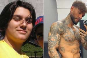 Lucas está com os cabelos maiores, sem barba, com o formato do rosto diferente e também sem tatuagens no braço. Na imagem, ele está ao lado do amigo Gabriel Valadares.