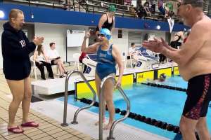A nadadora canadense Betty Brussel, de 99 anos, quebrou três recordes mundiais de natação em um único dia de competição, realizada em Saanich, no Canadá.