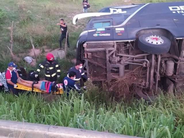 Ônibus da banda de Deivinho Novaes sai da pista e tomba na BR-101 em AL; vídeo